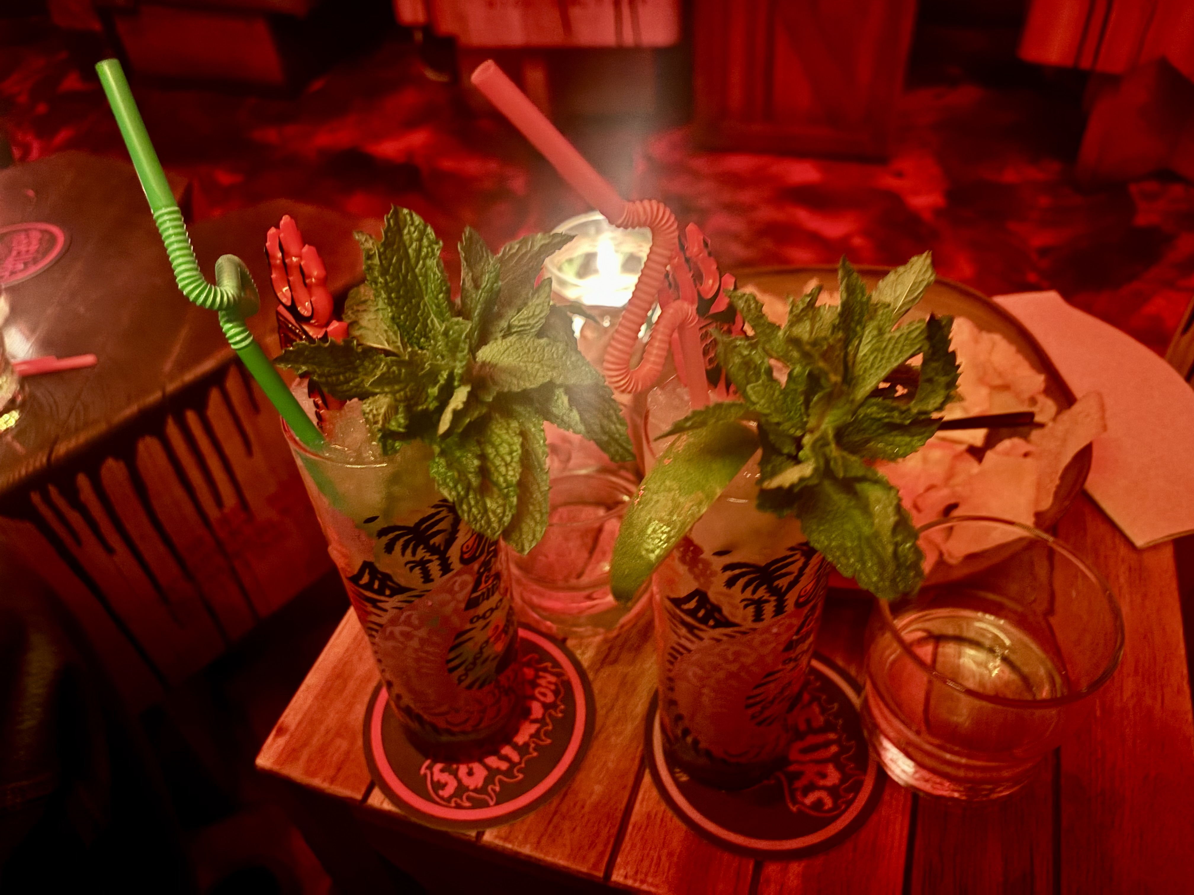 The entrance is hidden behind a wall of greenery, and inside you’ll find dim lighting, eerie surf-rock music, and spooky décor everywhere. We started with mojitos (fair warning: the drinks are strong), and then I ordered a blended banana cocktail that somehow tasted like a sugar cookie with buttercream frosting–unexpected, but delicious. They even put a fake spider on my frozen drink, which absolutely made me jump…worth it!